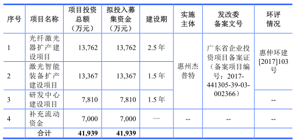 蘋果公司、華為和中興均在公司的前五大客戶。據(jù)招股書披露,杰普特本次IPO計(jì)劃募集資金4.19億元,其中7000萬補(bǔ)充流動資金,其余用于光纖激光器擴(kuò)產(chǎn)建設(shè)、激光智能裝備擴(kuò)產(chǎn)和研發(fā)中心建設(shè)項(xiàng)目。