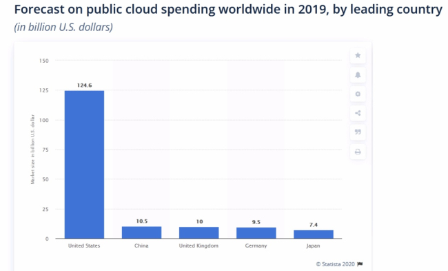 中國的云計算市場正在快速增長。根據(jù)Canalys的數(shù)據(jù),2019年,中國云基礎(chǔ)設(shè)施支出增長了63.7%,達(dá)到107億美元,使其成為全球第二大云市場,市場份額為10.8%。然而,根據(jù)IDC的數(shù)據(jù),與全球最大的美國公共云市場相比,中國的公共云市場規(guī)模微不足道。美國的云計算支出在2019年估計達(dá)到1240億美元,是第二大中國市場的十倍以上。