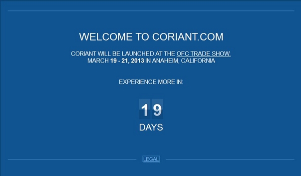 Coriant還提供了一個(gè)簡(jiǎn)易網(wǎng)頁(yè)---www.coriant.com---宣布該公司將宣布一個(gè)更好的網(wǎng)站。這個(gè)簡(jiǎn)易網(wǎng)頁(yè)上還提供OFC/NFOEC倒計(jì)時(shí)。
