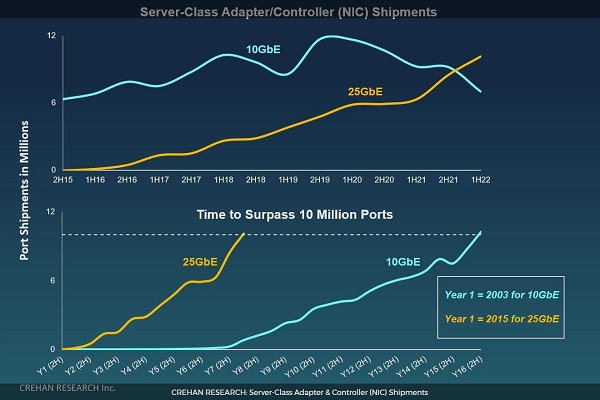 ICC訊(編譯:Nina)根據(jù)Crehan研究公司最近的一份報(bào)告,2022年上半年,全球25千兆以太網(wǎng)(GbE)適配器和控制器(NIC)的出貨量同比增長(zhǎng)了60%,超過(guò)了10千兆以太網(wǎng)(GbE)出貨量。這一增長(zhǎng)推動(dòng)25GbE出貨量超過(guò)1000萬(wàn)個(gè)端口,使得25GbE和總服務(wù)器級(jí)NIC出貨量雙雙創(chuàng)下紀(jì)錄。此外,25GbE達(dá)到1000萬(wàn)個(gè)端口出貨量的里程碑所用時(shí)間不及10GbE達(dá)到這一數(shù)字所需時(shí)間的一半(如下圖)。