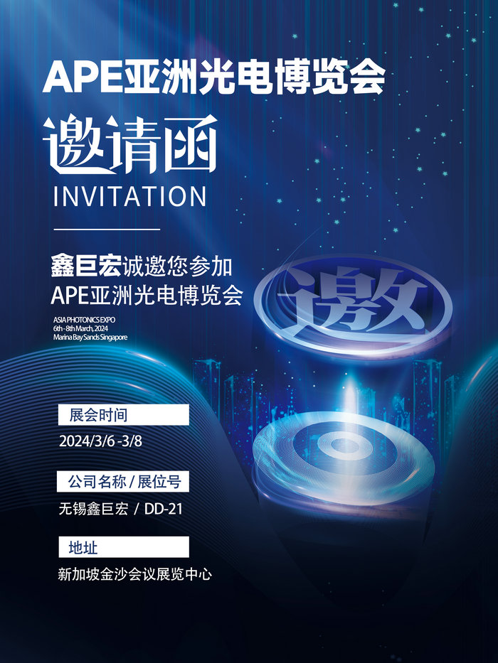 ICC訊 3月6至8日,APE亞洲光電博覽會(huì)將在新加坡金沙會(huì)議展覽中心舉辦,光學(xué)元器件和精密結(jié)構(gòu)件提供商無錫鑫巨宏智能科技有限公司(簡稱無錫鑫巨宏)將攜一系列光學(xué)透鏡、光模塊可伐鎢銅零部件、以及車載光學(xué)組件等產(chǎn)品隆重亮相,產(chǎn)品可廣泛應(yīng)用于5G和數(shù)通、車載光通信、醫(yī)療以、智能家庭以及AR/VR等領(lǐng)域。