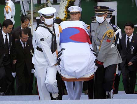 儀式結(jié)束后,在30輛挎斗式警用摩托車護(hù)衛(wèi)下,載有金大中靈柩的靈車經(jīng)過位于首爾麻浦區(qū)東橋洞的金大中宅邸、首爾廣場(chǎng)、首爾火車站、光化門等首爾標(biāo)志性建筑,最后抵達(dá)國(guó)立顯忠院的國(guó)家公墓。