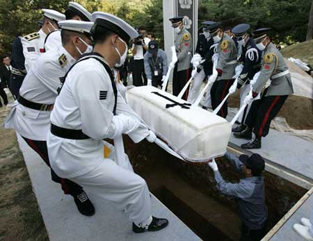 金大中的靈柩最終在國(guó)家公墓的銅雀洞下葬。此處也是該國(guó)第一任總統(tǒng)李承晚和前總統(tǒng)樸正熙的墓地。