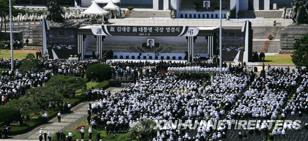 8月23日,韓國(guó)民眾在首爾參加已故前總統(tǒng)金大中的遺體告別儀式。當(dāng)日,韓國(guó)政府為已故前總統(tǒng)金大中舉行規(guī)模盛大的國(guó)葬。 新華社/路透