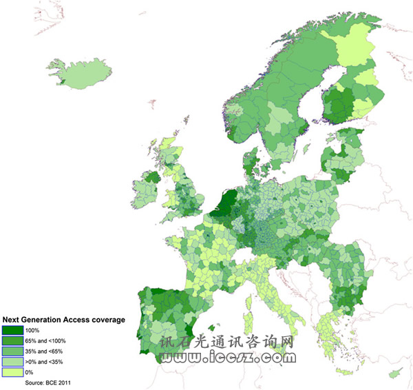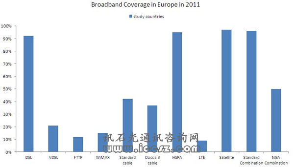 《2011歐洲寬帶覆蓋》調(diào)研報告顯示,歐洲近96%的家庭能夠獲得基本的寬帶,也就是說,只要他們想用,就可以獲得至少144kbps。超過50%的已經(jīng)可以使用超高速寬帶(也成為NGA,即下一代接入),可以提供30Mbps或更多。