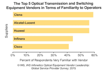IHS調(diào)查的服務(wù)供應(yīng)商占全球電信資本開(kāi)支的35%,調(diào)查中提名的設(shè)備商包括ADVA、阿爾卡特朗訊、BTI、Ciena、思科、Coriant、Cyan、ECI、愛(ài)立信、富士通、華為、Infinera、NEC、Transmode和中興。