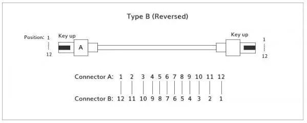 Type B(交錯(cuò)型):跳線兩端纖芯排列位置是相反的,即一端的1對(duì)應(yīng)另外一端的12,一端的12對(duì)應(yīng)的是另外一端的1。 兩端的key鍵朝向是相同的,即key up就對(duì)應(yīng) key up, key down 就對(duì)應(yīng) key down。