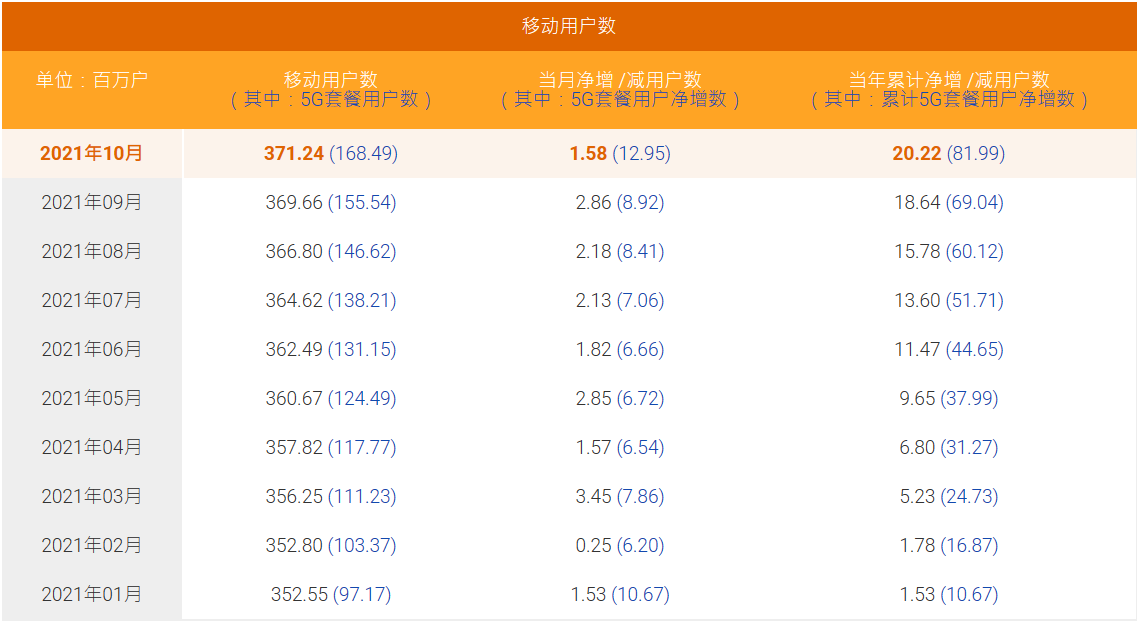 ICC訊 中國電信公布了2021年10月主要運(yùn)營數(shù)據(jù)。當(dāng)月,中國電信移動(dòng)用戶數(shù)凈增158萬戶,移動(dòng)用戶數(shù)累計(jì)3.7124億戶。當(dāng)月5G套餐用戶凈增1295萬戶,5G套餐用戶數(shù)累計(jì)1.6849億戶。