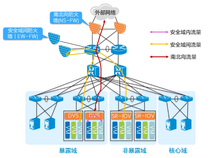 安全域間部署的東西向防火墻掛接在網(wǎng)關(guān)上,跨安全域的流量要經(jīng)過防火墻進(jìn)行互通。