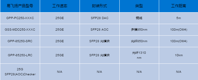 面對(duì)數(shù)據(jù)中心25G以太網(wǎng)互連應(yīng)用,易飛揚(yáng)可提供完整的產(chǎn)品線,根據(jù)實(shí)際應(yīng)用場(chǎng)景,可提供不同的方案組合,為客戶的方案選擇提供了極大的便利,產(chǎn)品線如下所示:
