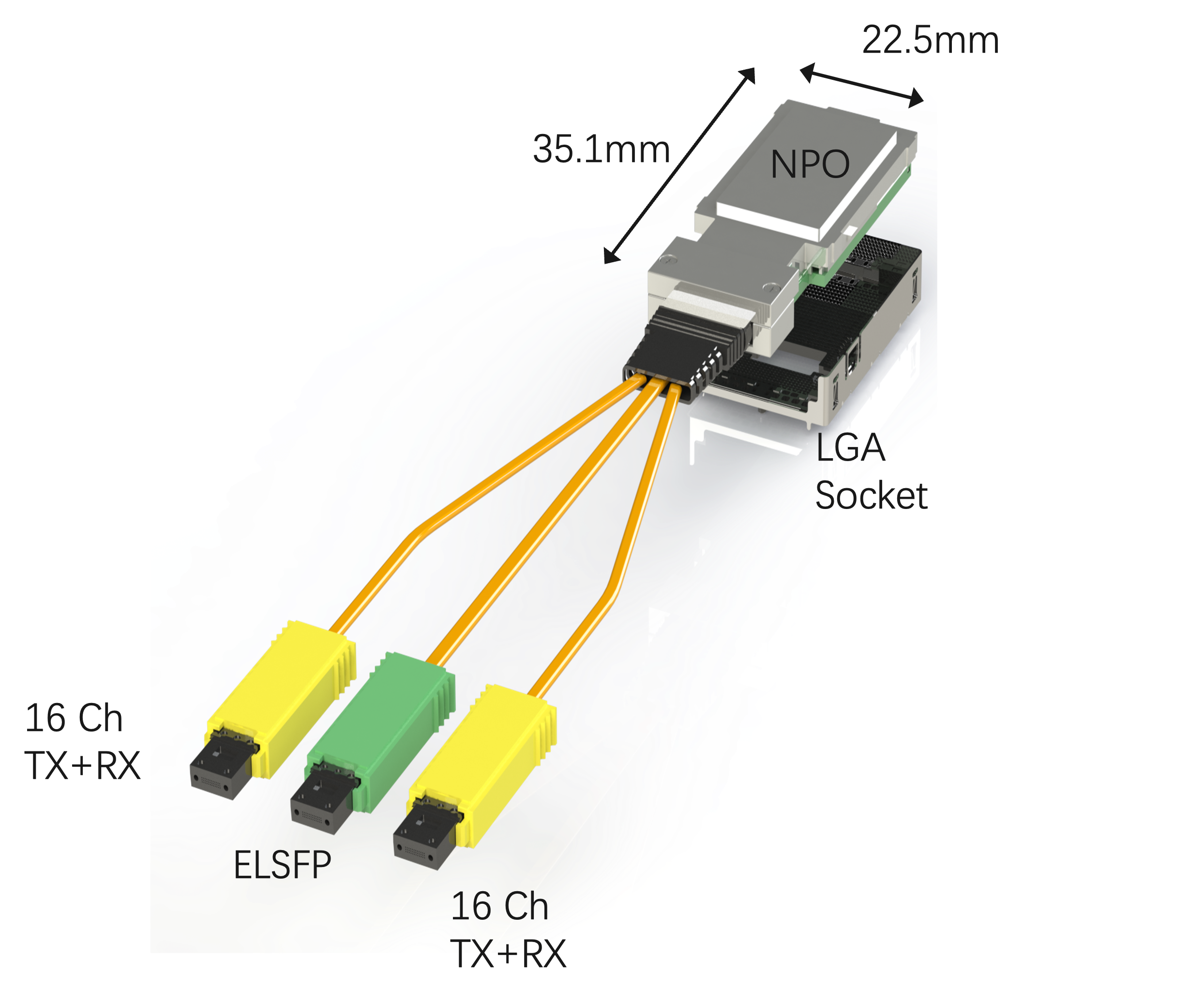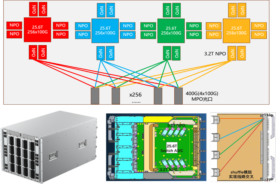 NPO 模塊緊鄰交換芯片部署,在芯片側(cè)完成電-光轉(zhuǎn)換,大幅縮短電通道、減少信號(hào)損耗;
