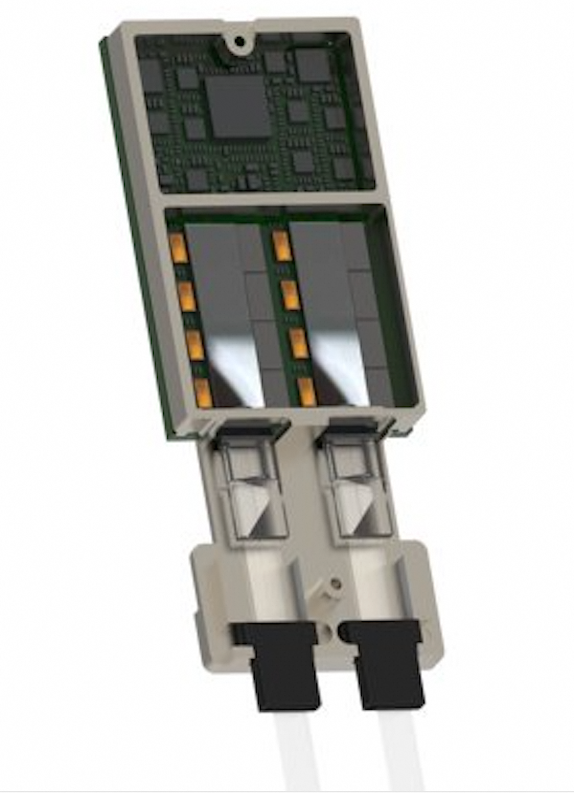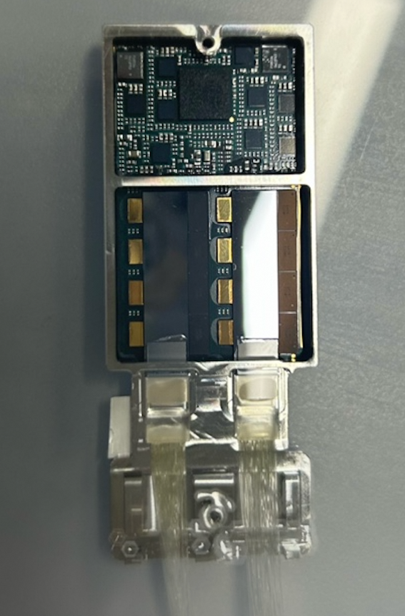 該模塊基于兩顆 16 通道收發(fā)一體硅光芯片,搭配線性直驅(qū) Driver/TIA 芯片,采用成熟的 2D 封裝工藝,將光子集成電路(PIC)與電子集成電路(EIC)倒裝集成于 mSAP 基板上,具備快速量產(chǎn)潛力。