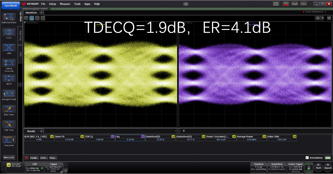 · 發(fā)送端:光眼圖性能優(yōu)異,典型 TDECQ 僅為 1.9dB,全面符合 IEEE 802.3bs DR4 標(biāo)準(zhǔn),可與傳統(tǒng)帶 DSP的 DR4 光模塊無(wú)縫互通,支持新舊架構(gòu)混合部署;
