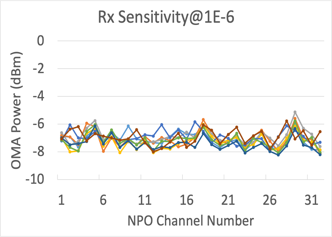 · 接收端:在 1E-6 誤碼率下,所有通道靈敏度優(yōu)于 -5dBm,確保充足鏈路預(yù)算;