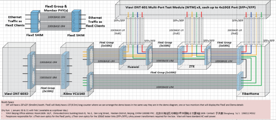 2018年1月,在VIAVI北京辦事處,VIAVI與華為、中興、烽火、Xilinx進(jìn)行了FlexE聯(lián)合測試,測試用例如圖所示,并成功在隨后的OFC上進(jìn)行功能展示。