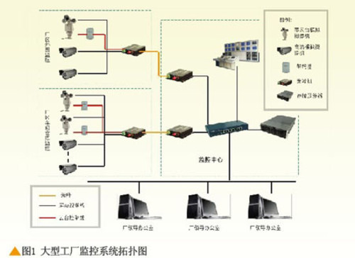 圖1為一大型工廠監(jiān)控系統(tǒng)拓?fù)鋱D,它分為廠區(qū)外圍監(jiān)控與廠區(qū)內(nèi)部車間以及倉(cāng)庫(kù)監(jiān)控。因廠區(qū)較大,如果采用同軸電纜或者雙絞線傳輸則可能都達(dá)不到傳輸?shù)木嚯x,故只能采用光纖傳輸。因?yàn)閮H供企業(yè)內(nèi)部實(shí)時(shí)監(jiān)控與觀看,故其不需要采購(gòu)價(jià)格較高的網(wǎng)絡(luò)攝像機(jī),只需用模擬攝像機(jī)即可,所以采用科地公司推出的Voptix系列數(shù)字視頻光端機(jī)就能很好地滿足此類要求,該系列1/2/4/8路視頻數(shù)字光端機(jī)分別有非網(wǎng)管型和網(wǎng)管型兩類產(chǎn)品。其中,對(duì)于非網(wǎng)管型光端機(jī),發(fā)射機(jī)和接收機(jī)都為小型化設(shè)計(jì),既可以獨(dú)立安裝,又可以在19英寸3U機(jī)架內(nèi)密集安裝和集中供電,并針對(duì)安防監(jiān)控市場(chǎng)量身定做的一款小型化1~8路視頻、音頻、數(shù)據(jù)、以太網(wǎng)等多業(yè)務(wù)信號(hào)光纖傳輸產(chǎn)品,具有性價(jià)比高、環(huán)境適應(yīng)性強(qiáng)、工作穩(wěn)定、安裝方便的特點(diǎn)。