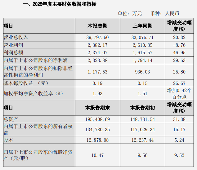 截至2025年末,公司總資產(chǎn)為195,408.69萬元,較年初增長31.38%;歸屬于上市公司股東的所有者權(quán)益為134,780.35萬元,較年初增長15.17%。歸屬于上市公司股東的每股凈資產(chǎn)為10.47元,較年初的9.56元增長9.52%。