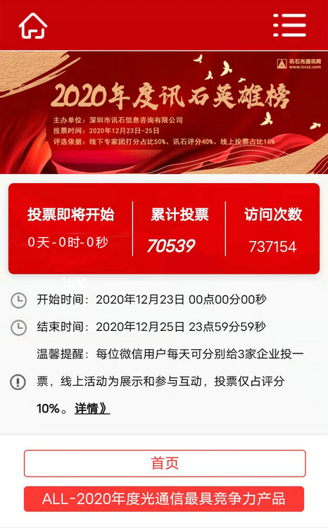 本屆訊石英雄榜是第八屆訊石英雄榜,歷屆英雄榜活動得到了光通信行業(yè)眾多優(yōu)秀企業(yè)的熱情參與,訊石英雄榜自推出投票以來,累計(jì)訪問量達(dá)到827.3萬,累計(jì)投票量達(dá)到138.69萬。其中2021年訪問量為73.71萬,有效投票數(shù)為7.05萬。在此也熱烈歡迎廣大訊石會員單位積極參與,在展示自我、標(biāo)榜實(shí)力的同時,也為同行帶來積極開拓的勇氣與決心。