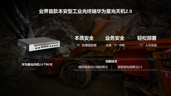 面向礦井和化工等高安全需求場(chǎng)景,華為推出了業(yè)界首款本安型工業(yè)光終端華為星光天機(jī)2.0,應(yīng)用于視頻回傳、傳感和機(jī)械控制等業(yè)務(wù)承載。相比上一代產(chǎn)品,華為星光天機(jī)2.0實(shí)現(xiàn)了網(wǎng)絡(luò)設(shè)備的本質(zhì)安全,業(yè)務(wù)安全和輕松部署: