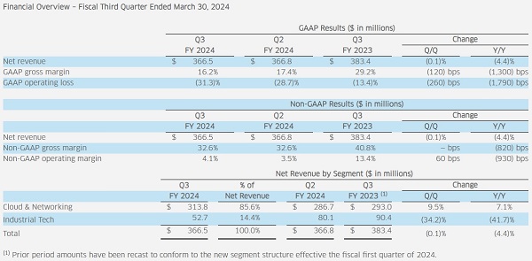 該季度營(yíng)收為3.67億美元,上個(gè)季度營(yíng)收3.67億美元,去年同期營(yíng)收3.83億美元。分部門來(lái)看,云和網(wǎng)絡(luò)(Cloud & Networking)部門營(yíng)收3.14億美元,上個(gè)季度營(yíng)收2.87億美元,去年同期營(yíng)收2.93億美元;工業(yè)技術(shù)(Industrial Tech)部門營(yíng)收5270萬(wàn)美元,上個(gè)季度營(yíng)收8010萬(wàn)美元,去年同期營(yíng)收9040萬(wàn)美元。