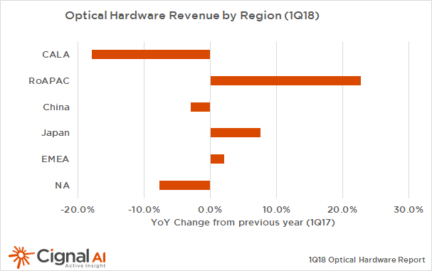 ICCSZ訊(編譯:Nina)根據(jù)研究公司Cignal AI的最新報(bào)告,2018年第一季度(Q118),全球光網(wǎng)絡(luò)硬件市場的增長集中在亞太地區(qū),尤其是中國以外的市場;EMEA(歐洲、中東和非洲)市場同比增長,大型設(shè)備供應(yīng)商對(duì)老牌運(yùn)營商未來支出走勢表示樂觀;北美市場光網(wǎng)絡(luò)支出持續(xù)下滑,表現(xiàn)弱于預(yù)期。