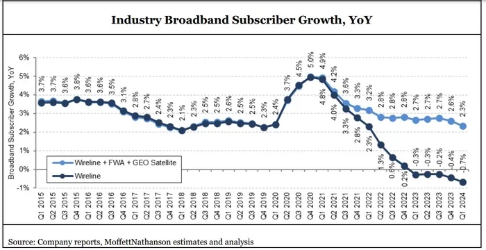 2024年第一季度,包括或不包括FWA和地球同步(GEO)衛(wèi)星寬帶提供商在內(nèi)的行業(yè)凈增長明顯放緩。MoffettNathanson在其最新的寬帶行業(yè)趨勢(shì)報(bào)告中估計(jì),整個(gè)市場(chǎng)的同比增長率降至2.3%,是自COVID-19大流行以來的最低水平。如果不包括FWA和GEO衛(wèi)星類別,增長率要差得多,為-0.7%。