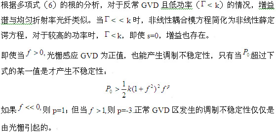 在光柵結(jié)構(gòu)中的調(diào)制不穩(wěn)定性研究包括兩個(gè)電場(chǎng)分量,一個(gè)為前向傳播分量,一個(gè)為后向傳播分量。這些場(chǎng)分量的演變得到了耦合模方程。我們知道在光柵中,低強(qiáng)度的脈沖傳輸可以被近似的描述為非線性薛定諤方程。實(shí)際上,在一些限定條件下,可以獲得非線性薛定諤方程的調(diào)制不穩(wěn)定性的解。然而在高強(qiáng)度脈沖的情況下,要使用完整的耦合模方程,那么不穩(wěn)定性的特性比由非線性薛定諤方程所得出的更為復(fù)雜。這些特性包括在正常色散中的不穩(wěn)定性。