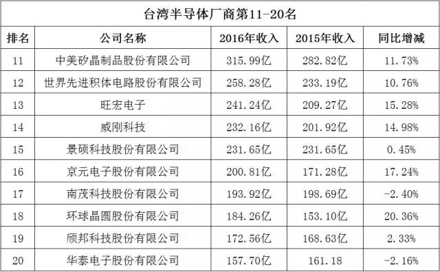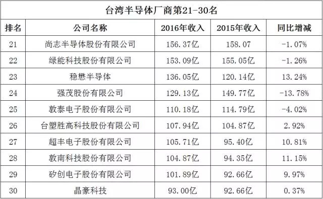 2016年臺灣上市半導(dǎo)體公司營收TOP 50