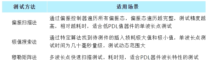 本方案結(jié)合電科思儀自主研發(fā)的6317A可調(diào)諧激光源、9951A光波測試平臺,集成相關(guān)算法,優(yōu)化了波長快速掃描測試。關(guān)于WDL的測試方法行業(yè)通用,但是PDL不同測試方法有不同適用場景(如下表所示),綜合各測試方法的特點,穆勒矩陣法更適合 PDL波長特性的測試,因此本方案采用穆勒矩陣法。