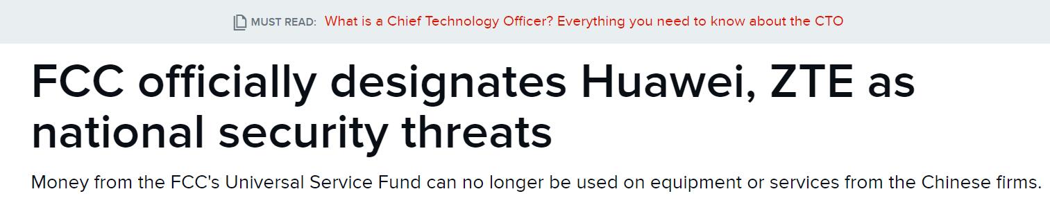 ICC訊 據(jù)美國(guó)媒體報(bào)道,6月30日,美國(guó)聯(lián)邦通信委員會(huì)(FCC)宣布中國(guó)電信巨頭華為和中興通訊 “國(guó)家安全威脅”,此舉將正式禁止美國(guó)電信公司使用聯(lián)邦資金購(gòu)買和安裝華為和中興設(shè)備。