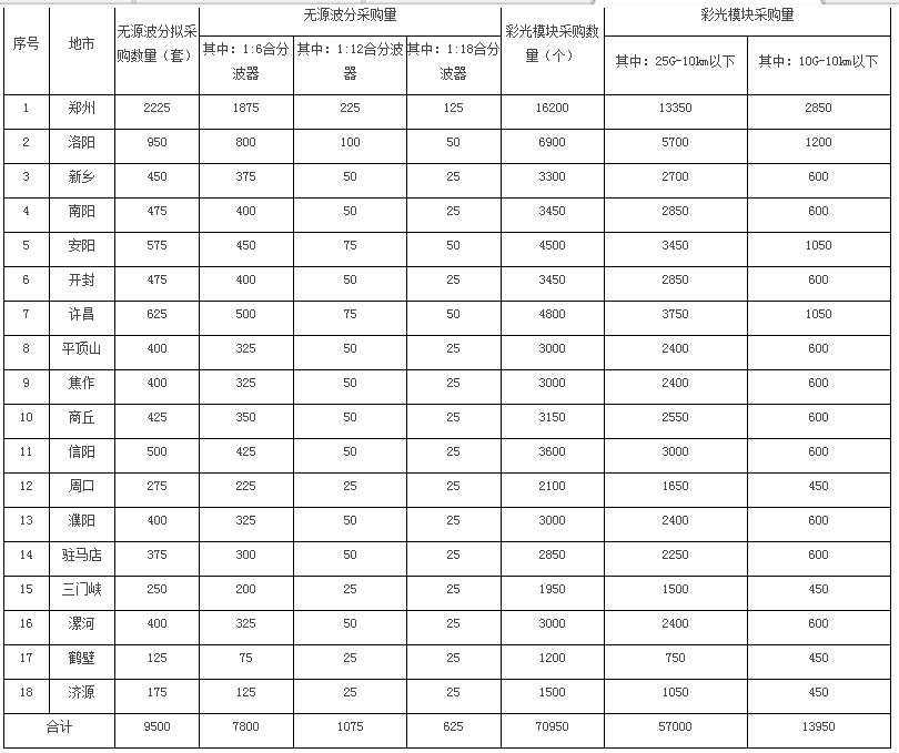 根據(jù)此前招標(biāo)公告,本次招標(biāo)內(nèi)容共9500套無源波分復(fù)用設(shè)備,70950個彩光模塊及安裝配件輔材;其中:1:6合分波器7800套,1:12合分波器1075套,1:18合分波器625套),25G彩光模塊57000個,10G彩光模塊13950個。