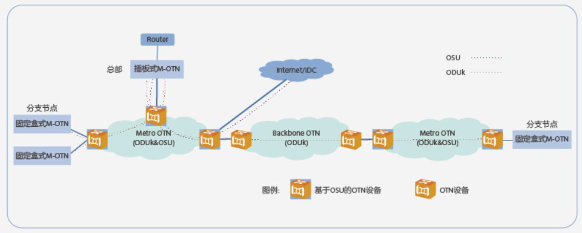 基于OSU的OTN設(shè)備是傳統(tǒng)OTN設(shè)備的優(yōu)化和擴(kuò)展,通過引入OSU技術(shù),可提供低成本、低時(shí)延、低功耗的以城域應(yīng)用為主的綜合業(yè)務(wù)承載方案?;?A href="http://m.n2software.net/site/CN/Search.aspx?page=1&keywords=OSU&column_id=ALL&station=%E5%85%A8%E9%83%A8" target="_blank">OSU的OTN設(shè)備在網(wǎng)絡(luò)中的部署如圖1所示。