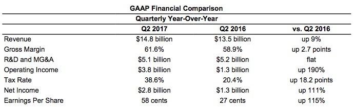 ICCSZ訊 英特爾今日公布了2017財年第二季度財報。財報顯示,英特爾第二季度營收為147.63億美元,與去年同期的135.33億美元相比增長9%;凈利潤為28.08億美元,與去年同期的13.30億美元相比增長111%。