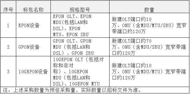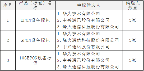 上圖顯示,EPON/GPON、10G PON三個標(biāo)包的中標(biāo)廠商均是華為、中興通訊、烽火通信三家,名次相同。