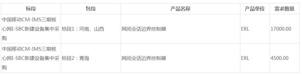 本次采購(gòu)內(nèi)容為固網(wǎng)的I-SBC新建設(shè)備,共計(jì)2.15萬(wàn)ERL。其中標(biāo)段1為1.7萬(wàn)ERL,標(biāo)段2為4500ERL。本次集采是中國(guó)移動(dòng)CM-IMS三期建設(shè)的一個(gè)組成部分。