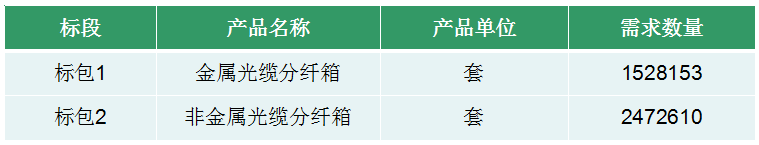 ICCSZ訊 近日,中國移動(dòng)啟動(dòng)2017年度光纜分纖箱產(chǎn)品集中采購項(xiàng)目(第二批次),要求產(chǎn)品需滿足6個(gè)月的建設(shè)需求,共計(jì)采購光纜分纖箱4000763套,實(shí)際采購量以訂單為準(zhǔn)。