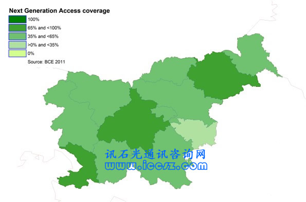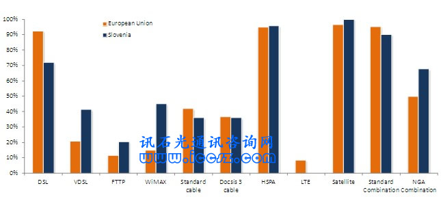 《2011歐洲寬帶覆蓋》調(diào)研報(bào)告顯示,斯洛文尼亞基本寬帶覆蓋率(至少提供144kbps的服務(wù),只要他們愿意)達(dá)90%,超高速寬帶(也稱為NGA,即下一代接入)覆蓋達(dá)68%。在調(diào)研的29個國家中(歐盟27國和挪威、冰島),96%能夠獲得基本寬帶,超過50%(一半國家走向2020數(shù)字天堂目標(biāo))能夠獲得超高速。