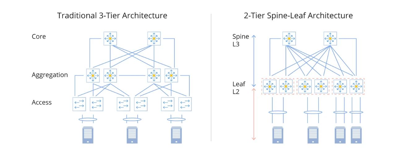 800G光模塊需求的激增與數(shù)據(jù)中心網(wǎng)絡(luò)架構(gòu)的變化密切相關(guān)。傳統(tǒng)的三層架構(gòu)(包括接入層、聚合層和核心層)多年來一直是標(biāo)準(zhǔn)。隨著AI技術(shù)規(guī)模和東西向流量的不斷擴(kuò)大,數(shù)據(jù)中心網(wǎng)絡(luò)架構(gòu)也在不斷演進(jìn)。在傳統(tǒng)的三層拓?fù)渲?,服?wù)器之間的數(shù)據(jù)交換需要經(jīng)過接入交換機(jī)、匯聚交換機(jī)和核心交換機(jī),這給匯聚交換機(jī)和核心交換機(jī)帶來了巨大的壓力。