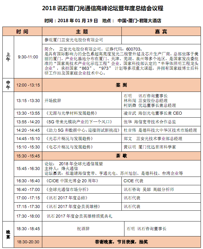 2018年1月19日,由訊石信息咨詢(深圳)有限公司主辦、三安光電股份有限公司協(xié)辦、廈門優(yōu)迅高速芯片有限公司支持的《訊石廈門光通信高峰論壇暨暨年度總結會議》將在中國·廈門君隆大酒店隆重舉辦,誠邀廣大光通信同仁齊聚訊石廈門“尾牙”。