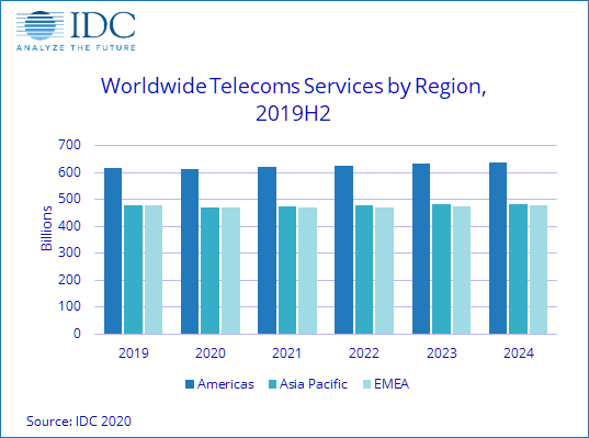 ICC訊(編譯:Nina)根據(jù)IDC的全球半年度電信服務(wù)跟蹤報(bào)告,2020年,全球電信和付費(fèi)電視服務(wù)市場(chǎng)將達(dá)到1.55萬億美元,相比2019年小幅下降1.4%。IDC預(yù)測(cè)該市場(chǎng)將從2021年開始復(fù)蘇,但要到2022年才能恢復(fù)到危機(jī)前的水平。