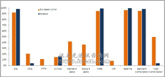 《2011歐洲寬帶覆蓋》調(diào)研報(bào)告顯示,希臘99%的家庭能夠獲得基本寬帶至少144kbps數(shù)據(jù)的寬帶,只要他們?cè)敢?。然而,僅有4%的希臘家庭能夠使用超高速寬帶(也稱(chēng)為NGA,即下一代接入)。在調(diào)研的29個(gè)國(guó)家中(歐盟27國(guó)和挪威、冰島),96%能夠獲得基本寬帶,超過(guò)50%(一半國(guó)家走向2020數(shù)字天堂目標(biāo))能夠獲得超高速。