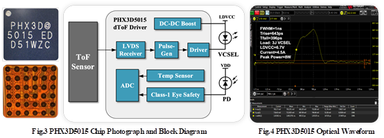 PHX3D5015是一款用于3D-dToF應(yīng)用的單通道VCSEL驅(qū)動(dòng)芯片,采用2.40mm*2.40mm WLCSP封裝,內(nèi)部集成了 Temp Sensor、脈沖發(fā)生器、DC-DC Boost等多個(gè)模塊,極大簡(jiǎn)化模組設(shè)計(jì),節(jié)省客戶成本。內(nèi)置的脈沖發(fā)生器可以產(chǎn)生500ps~2ns可調(diào)的脈沖信號(hào),光脈沖上升下降沿<1ns,保證Sensor出圖的精度和效果。內(nèi)置的DC-DC Boost模塊最大支持9V的VCSEL供電電壓,輸出高達(dá)7.6A的峰值電流,搭配多節(jié)VCSEL,>10m距離的3D-dToF應(yīng)用。