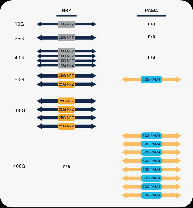 由于PAM4在每個符號時隙中傳輸兩比特,因此它將信號帶寬減半。調制格式讓使用25 GHz速率以50 Gb/s傳輸數據成為可能。在SFP56中,26.5625 Gbaud的物理線路速率可以實現51.125 Gb/s的實際數據速率。SFP56電口專為56 Gb/s的信號速率而設計,以適應OTN開銷。
