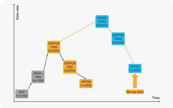 SFP56模塊利用已經廣泛應用于400G收發(fā)器的成熟50G技術,在QSFP-DD封裝(QSFP56-DD)中使用8路50G。SFP56技術對于當前網絡運營商來說是一項將現有的SFP28鏈路數據率提升一倍的有效方式。