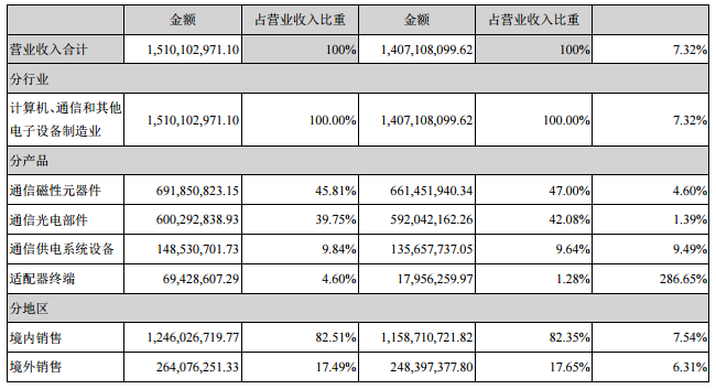 銘普光磁主要生產(chǎn)通信磁性元器件、通信光電部件、通信供電系統(tǒng)設備三大類產(chǎn)品。在2017年度的營業(yè)收入中,通信磁性元器件產(chǎn)品年營收為6.97億元,占年度總營收45.81%,同比增長4.60%;通信光電部件產(chǎn)品年營收6.003億元,占年度總營收39.75%,同比增長1.39%;通信供電系統(tǒng)設備產(chǎn)品年營收1.49億元,占年度總營收9.84%,同比增長9.49%;適配器終端產(chǎn)品年營收6.94千萬元,占年度總營收4.60%,同比增長286.65%。目前,銘普光磁的主要市場在國內,境內銷售額占2017年度總銷售額82.51%。前五名客戶合計銷售金額6.696億元,占年度銷售總額比例44.34%。