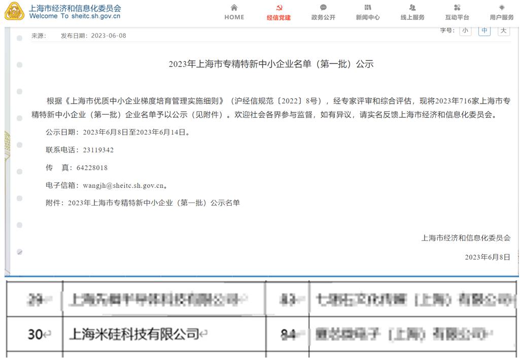 ICC訊 2023年6月,上海市經(jīng)濟(jì)和信息化委員會(huì)對(duì)“專(zhuān)精特新”中小企業(yè)認(rèn)定情況進(jìn)行了公布。上海米硅科技有限公司被認(rèn)定為上海市“專(zhuān)精特新中小企業(yè)”。