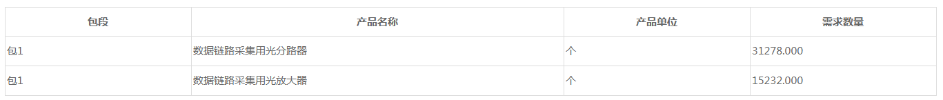 根據(jù)此前招標(biāo)公告顯示,本期集中采購產(chǎn)品為數(shù)據(jù)鏈路采集用光分路器和光放大器,預(yù)估采購規(guī)模為數(shù)據(jù)鏈路采集用光分路器31,278套和光放大器15,232套,設(shè)置最高投標(biāo)限價為5,014.49萬元(不含稅總價)。