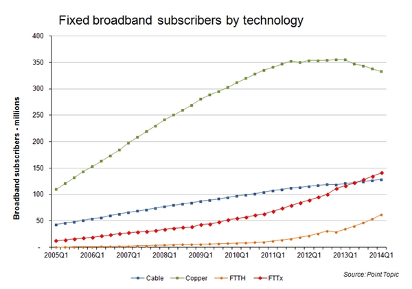ICCSZ訊(編譯:Nina)Point Topic數(shù)據(jù)顯示,截止2014年3月底,全球固網(wǎng)寬帶用戶達(dá)到6.901億。由于截止2013年12月底的季度,全球固網(wǎng)寬帶用戶環(huán)比僅增長(zhǎng)0.4%,在此基礎(chǔ)上,Q114全球固網(wǎng)寬帶用戶環(huán)比增幅上升至1.9%,為過(guò)去一年來(lái)最高增幅。