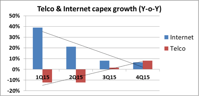 2015年下半年(2H15)資本開支由數(shù)據(jù)中心到電信市場轉(zhuǎn)變