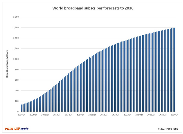 Figure 1. Forecast of total global fixed broadband subscriber lines to 2030. Source: Point Topic.